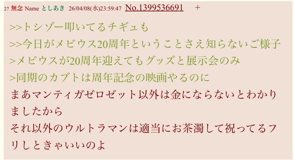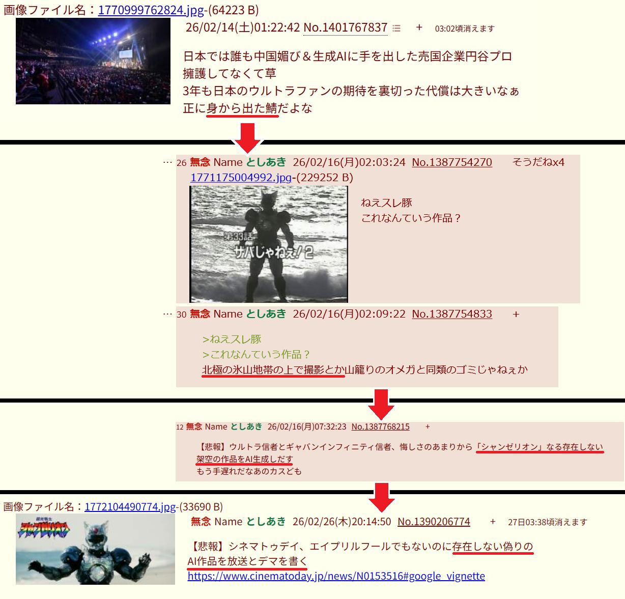 | … | 2126/04/09(木)00:51:06No.1418571606そうだねx6>ご覧ください匿名の掲示板で円谷プロの関係者と思われる書き込みです |