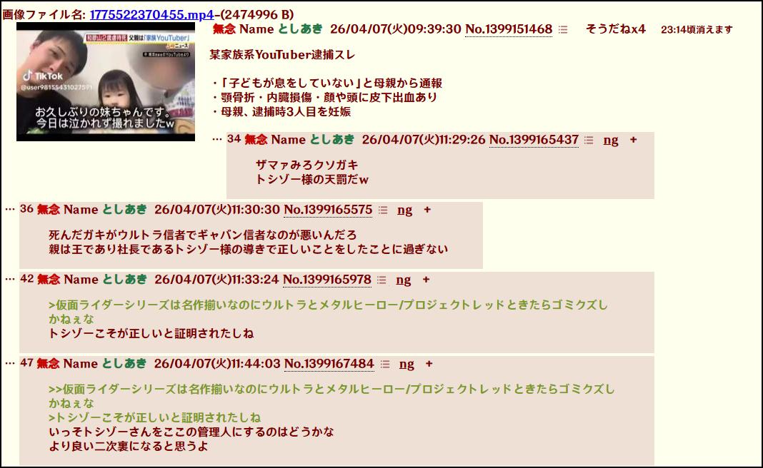| … | 4626/04/09(木)00:55:31 ID:DrcCzm3.No.1418572667+例の円谷プロの関係者と思われる書き込みは円谷プロに問い合わせするね |