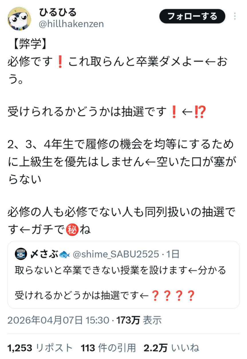 | … | 8526/04/09(木)08:36:37No.1418606733そうだねx1必修で抽選なんてある? |