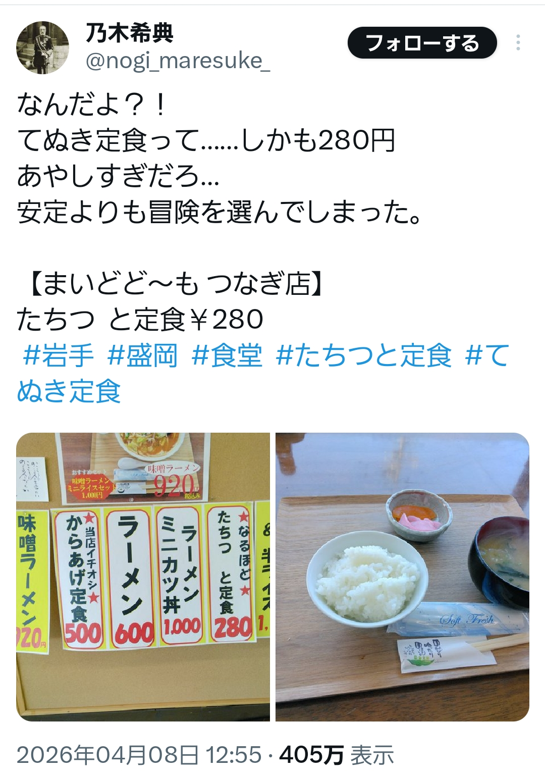 | … | 7026/04/09(木)13:41:21No.1418666620+そもそも主菜なしで定食の定義を満たせるのだろうか |