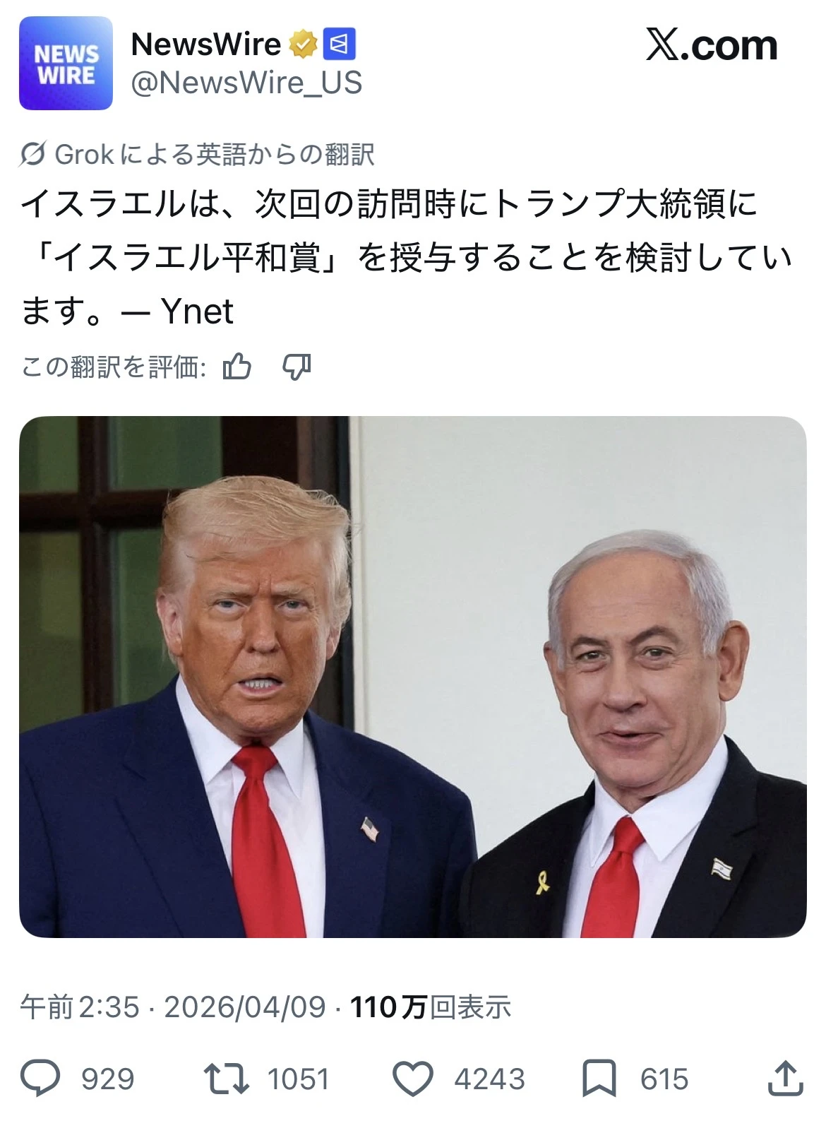 | … | 2026/04/09(木)15:30:23No.1418687256+ちゃんとイスラエルの国名を冠した平和賞だから許すが… |
