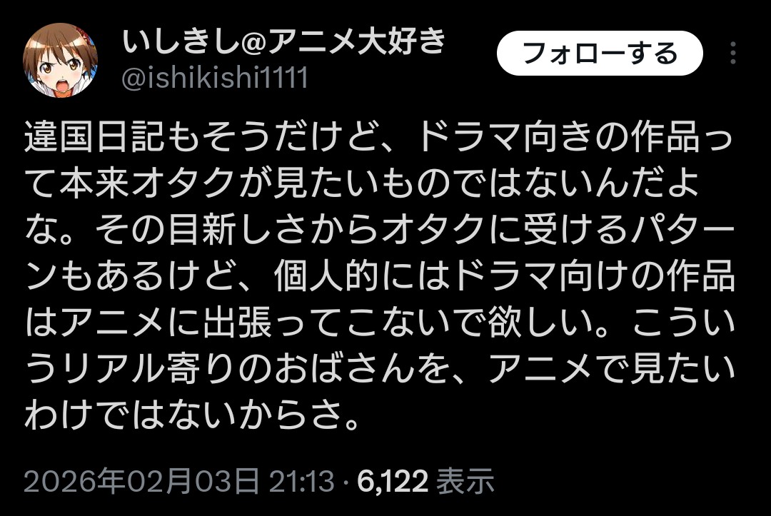 | … | 1926/04/09(木)17:57:17No.1418716483そうだねx1この意見がカスなのは前提としてこれで挙げられたアニメを腐されたって思う人が割といるのがヤバいなって思う |