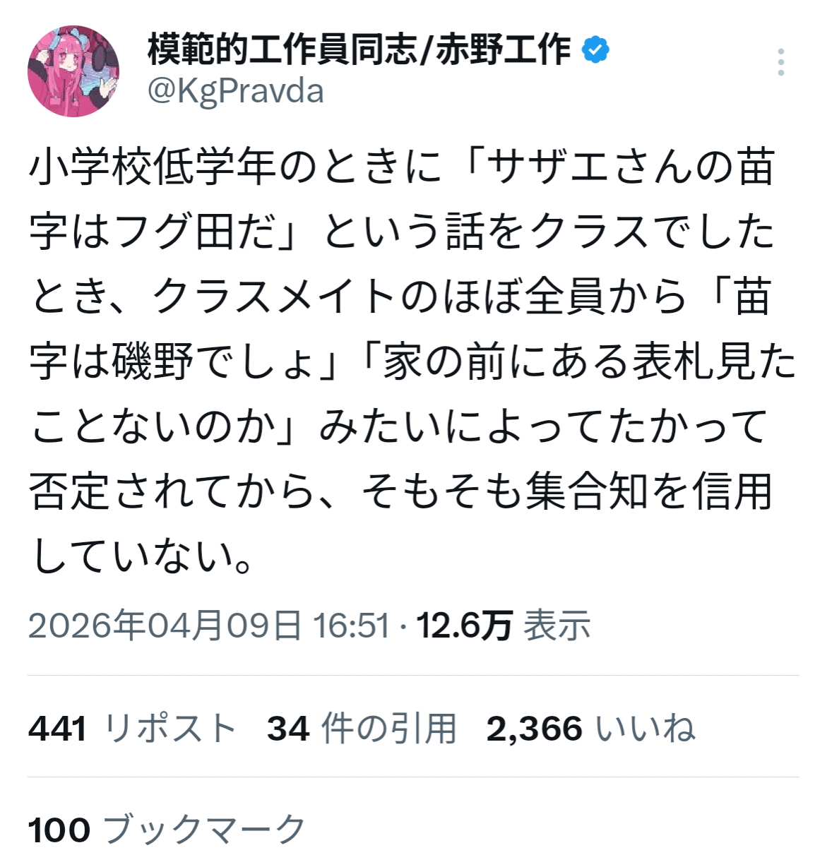 | … | 3026/04/09(木)19:46:25No.1418750561そうだねx5>「サザエさんの苗字〜」って会話のフックだと家全体の話と受け取られかねない気がしなくもない |