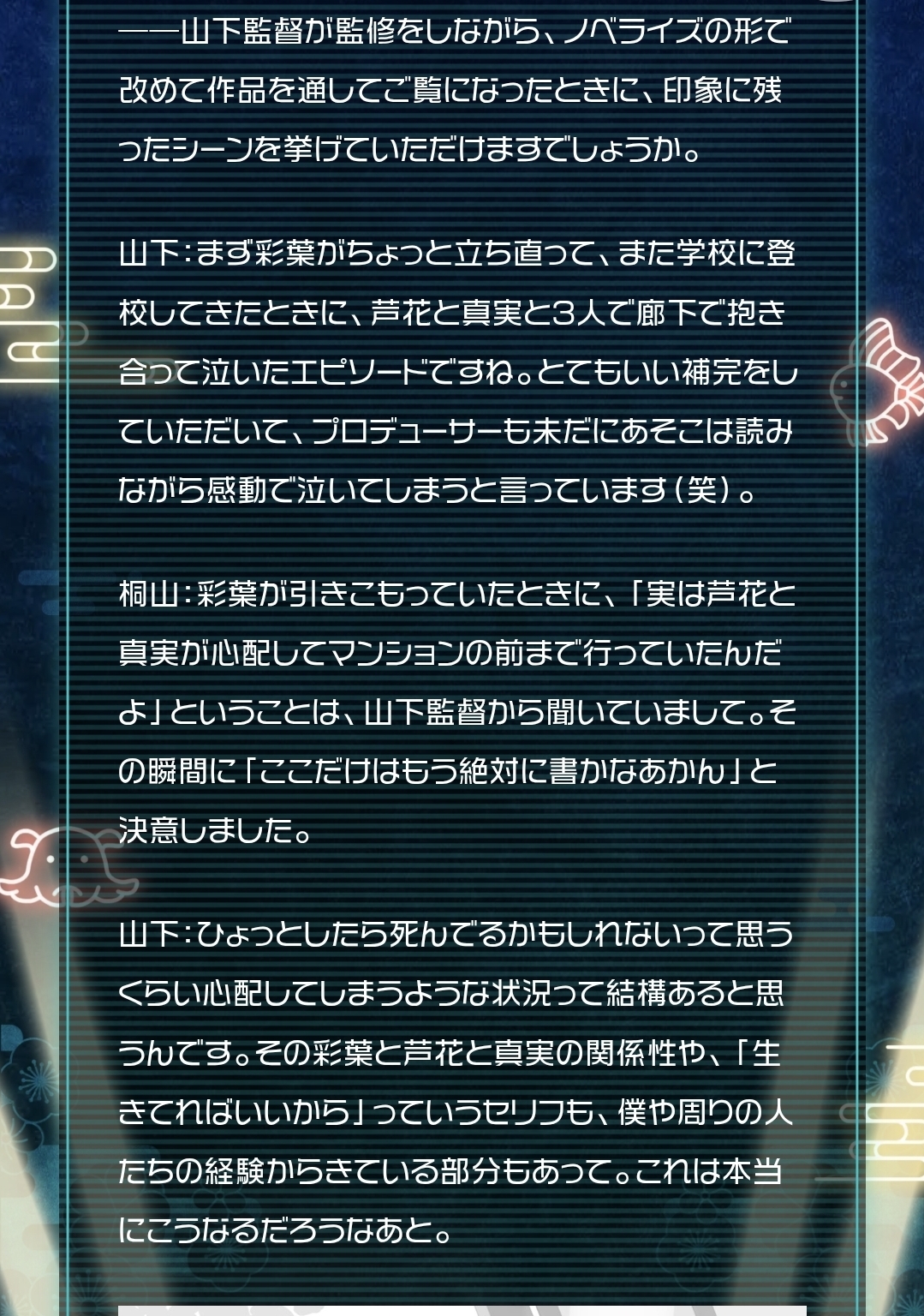 | … | 5826/04/09(木)23:36:19No.1418830371+>>小説版は芦花真実が家まで来てくれたところに気付くシーンも好き |