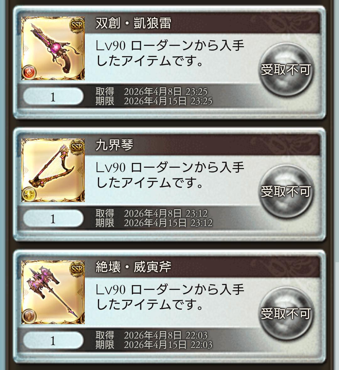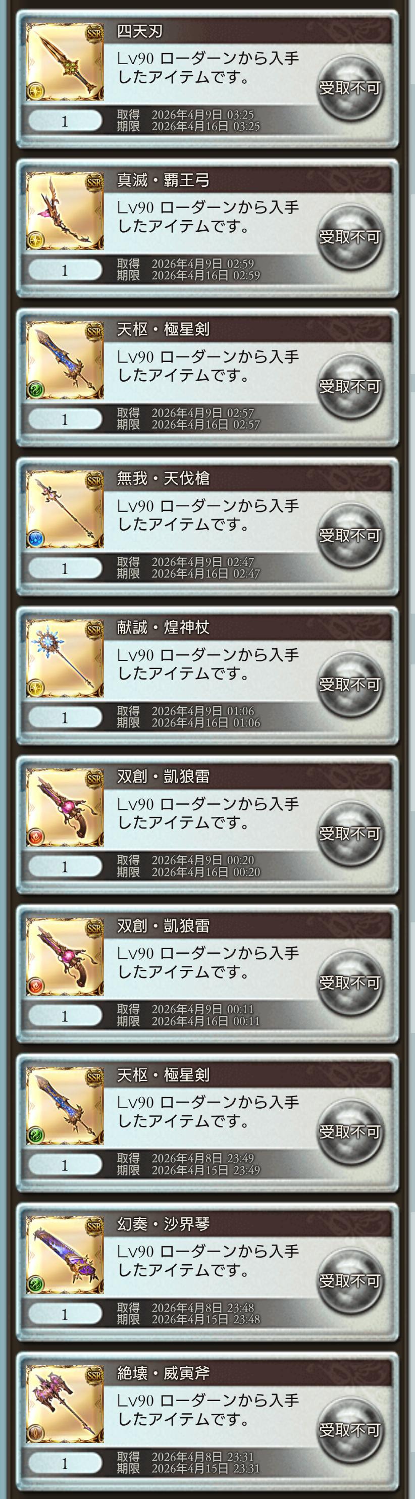 | … | 7926/04/09(木)23:48:20No.1418834133+90HELL周回もがんばったから極星武器もかなり多めに落ちてますわ嬉しいですわ 5凸用に砕いたのが8本ほどありますので18本ほど落ちてることになりますわ fu6528594.png |