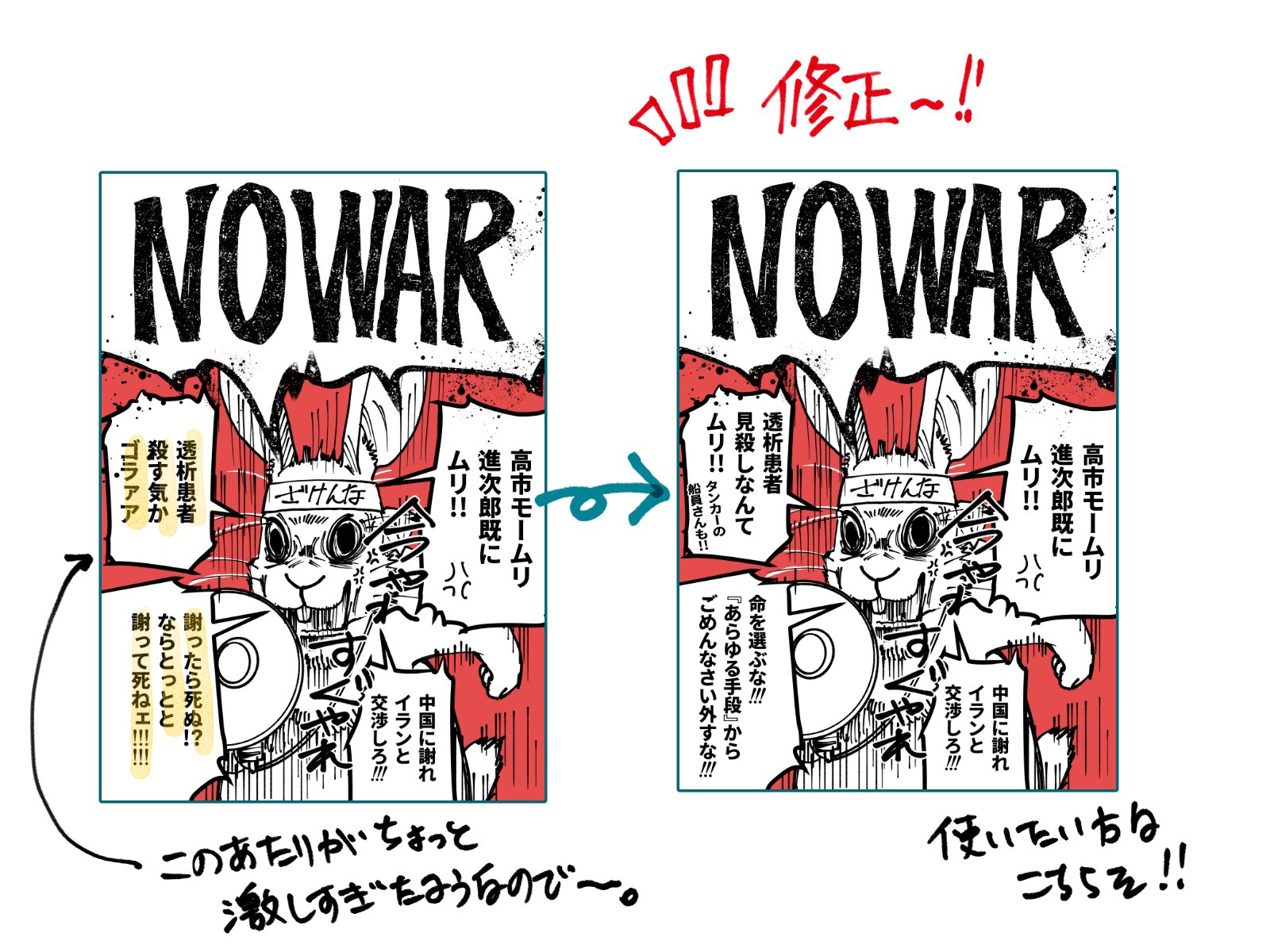 | … | 12126/04/10(金)12:15:53No.1418925270+これ他人が描いたNO WARのウサギをこんな使い方してるの…?マジ…? |