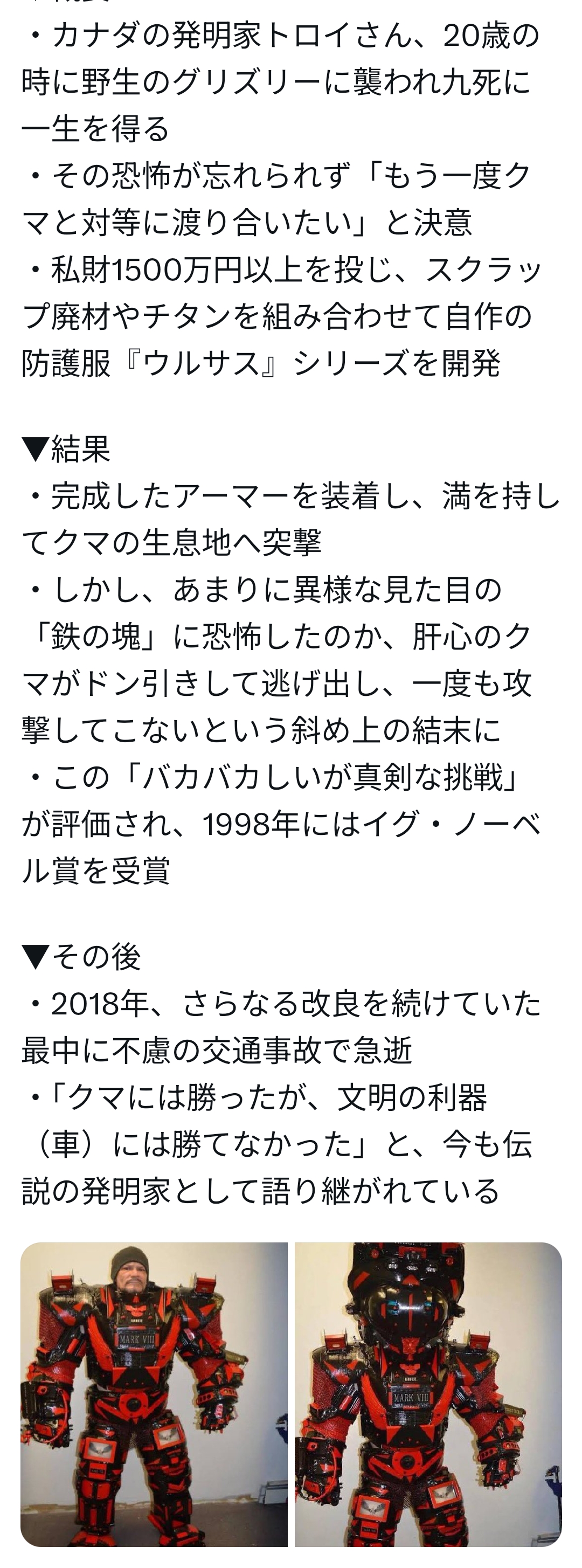 | … | 3426/04/10(金)15:54:13No.1418974440+なんか別人が対グリズリースーツ作ったけどグリズリーに敵わなかったとかあったような… |