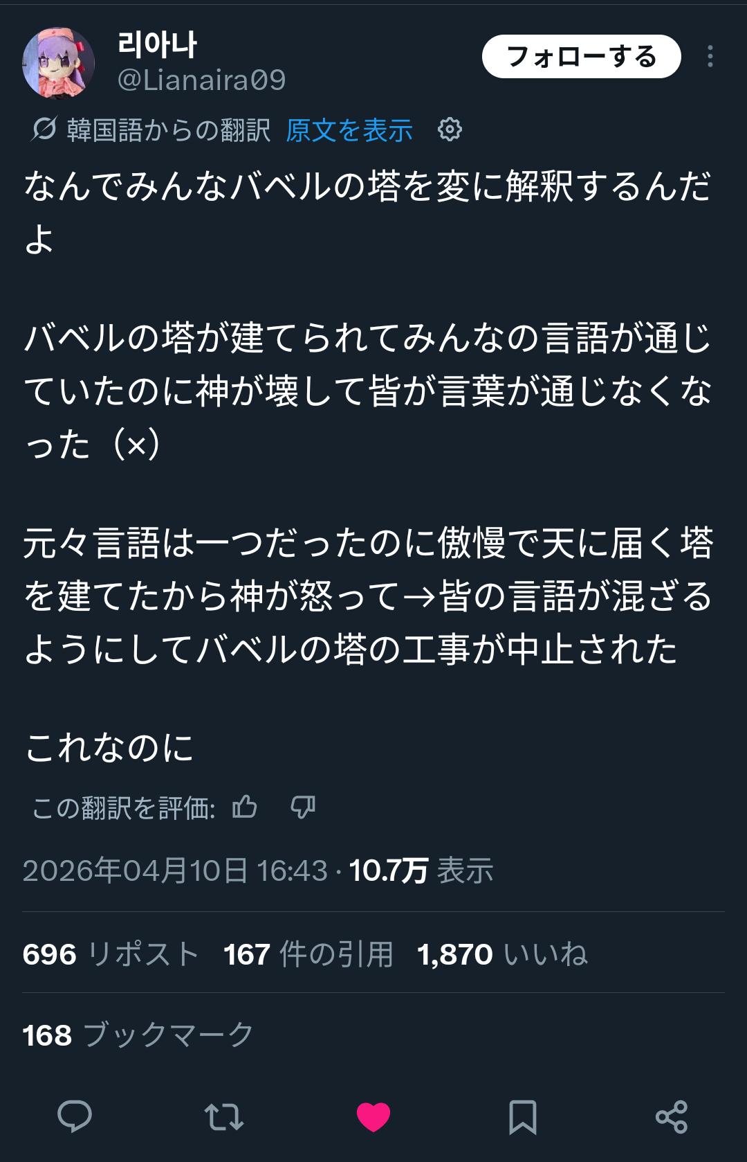 | … | 1626/04/10(金)20:28:56No.1419051945+>翻訳機能のおかげで世界中でアホな呟きがされているのが分かったのはいいことだ |