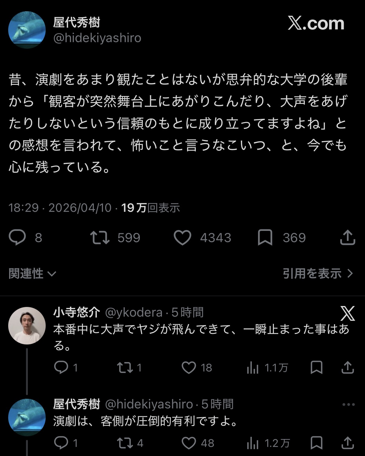 アドリブに客が拍手してた時鳴り終わるまで次のセリフ待ってたのを見てこれ客席から簡単に干渉できるな?と思った