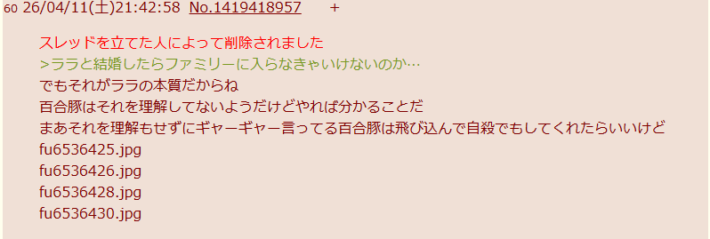 | … | 29526/04/11(土)23:22:41No.1419458796そうだねx1百合好きと左翼って同類だよな 与党(公式)に突っかかるばかりで普通の日本人からは鬱陶しいと思われてる |