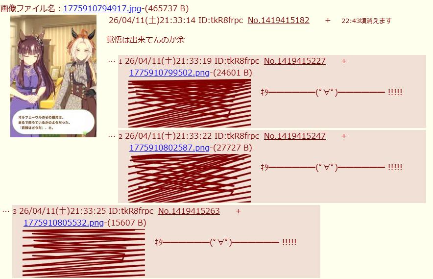 | … | 2626/04/11(土)22:43:10 ID:h/MiqrI.No.1419443993+削除依頼によって隔離されました |