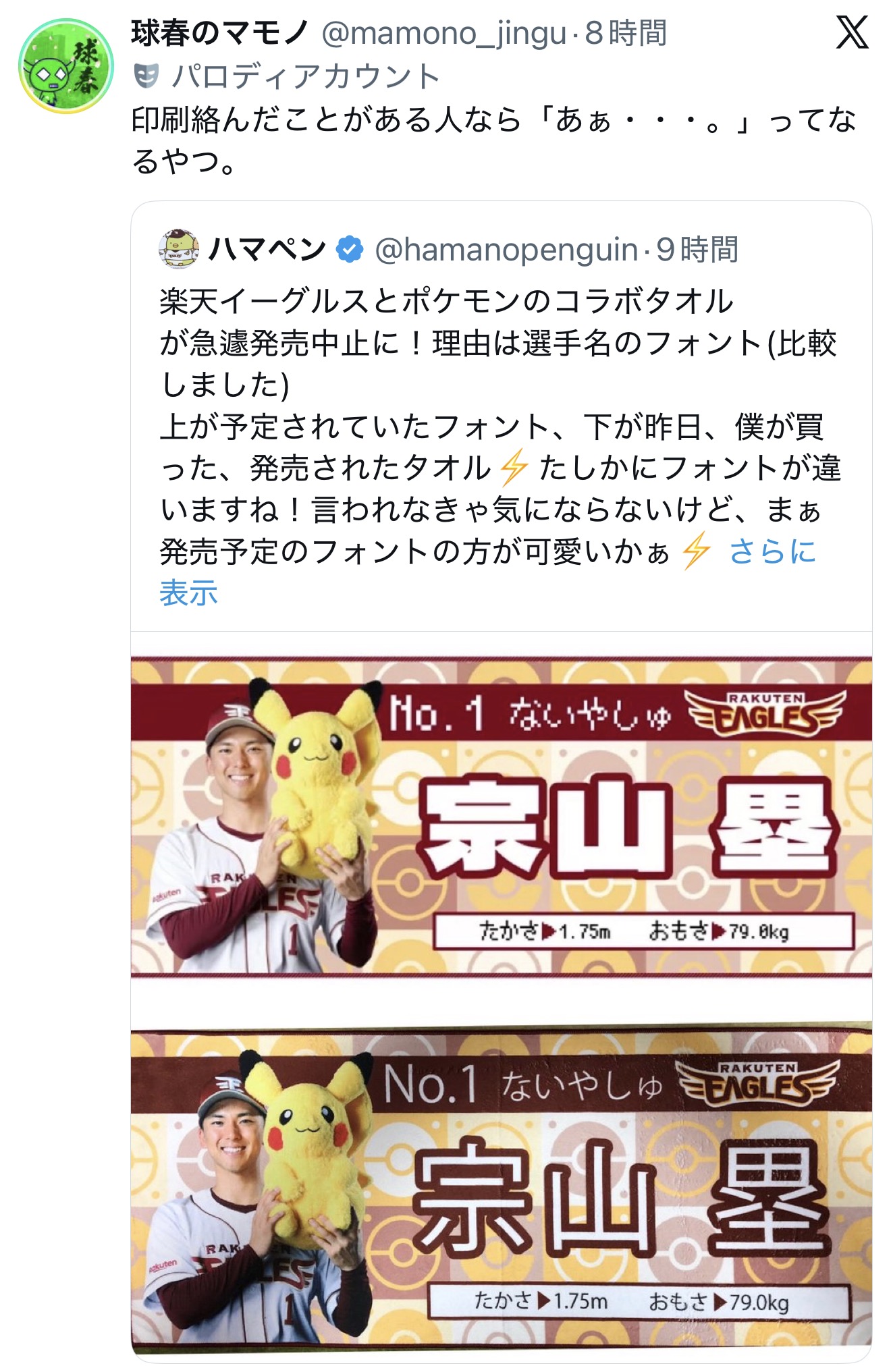 | … | 8126/04/12(日)02:28:42No.1419509594+今回の野球ポケモンコラボ全部の球団でグッズかなり売れてるらしいしこれの交換大変そうだな… |