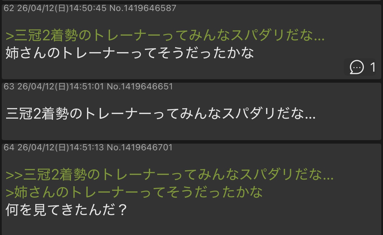 | … | 14526/04/12(日)15:08:12No.1419651412そうだねx6>いつになったら普通にウマ娘の話するの? |