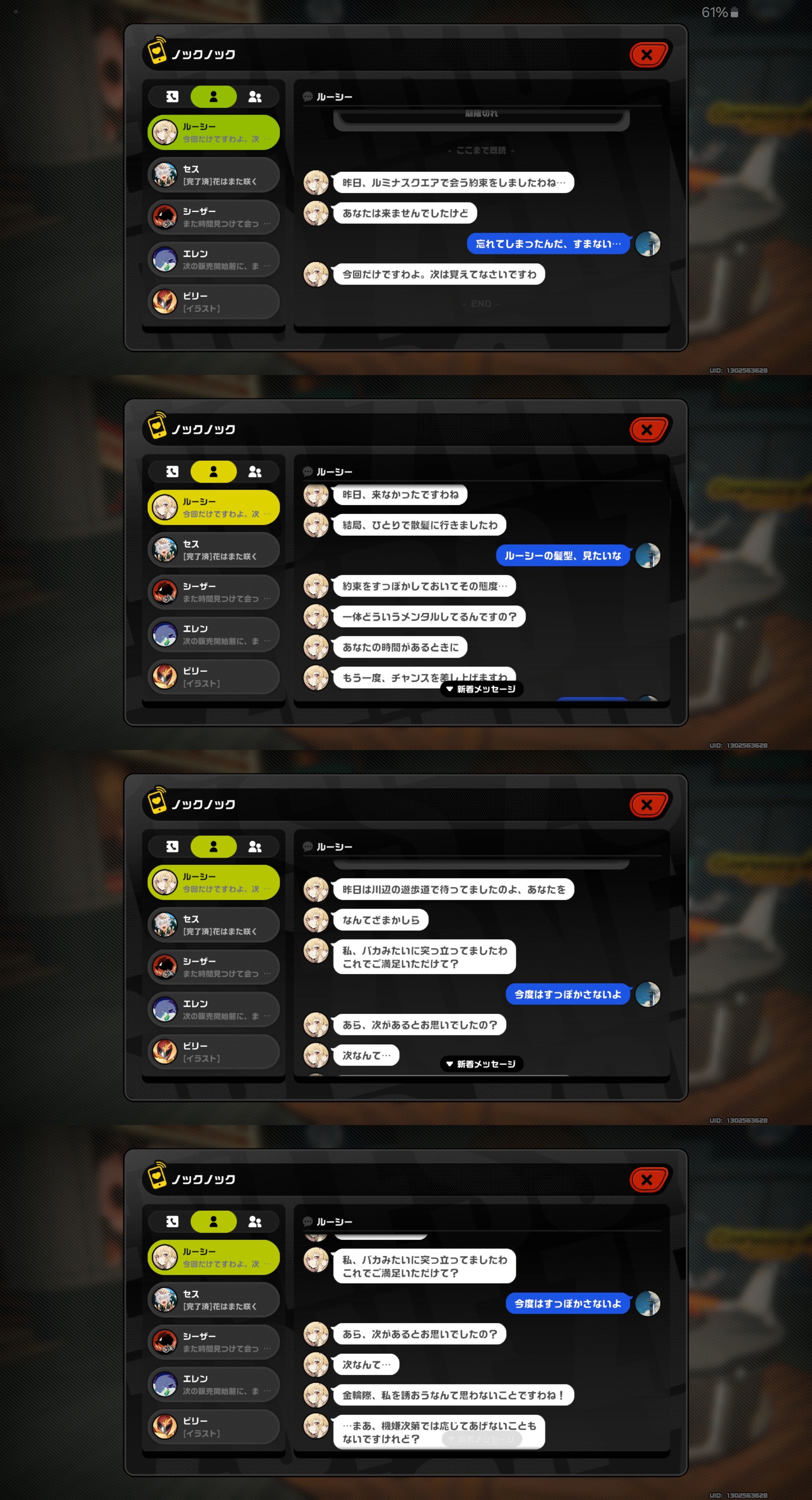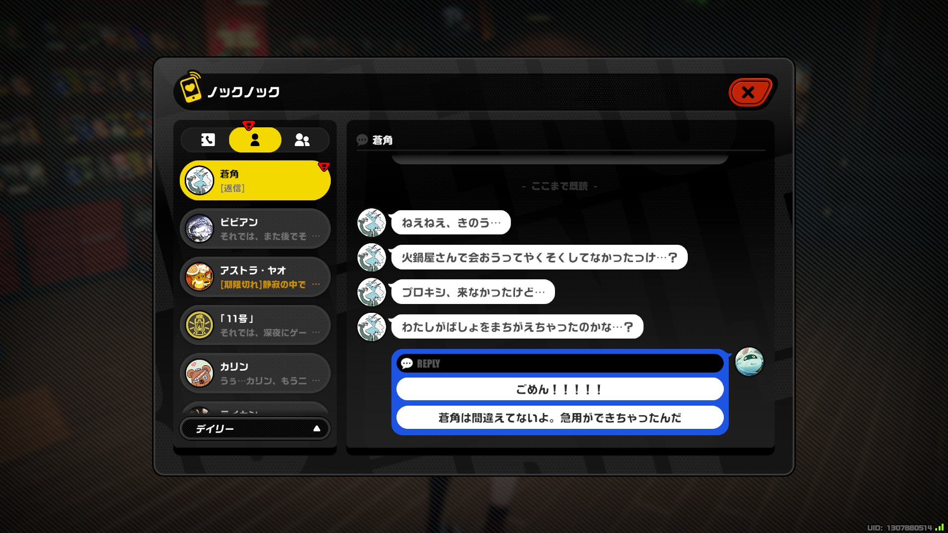 | … | 38526/04/12(日)21:58:30No.1419814258+>赤い枠でどっちで行くかの選択肢出たらそのままノックノックの画面閉じて放置ですっぽかせるよ >ワープしちゃった場合でも話しかけずに帰ればいい パエトーン様…一回ビビアンの目の前まで来たのになぜ帰るのです……? |
