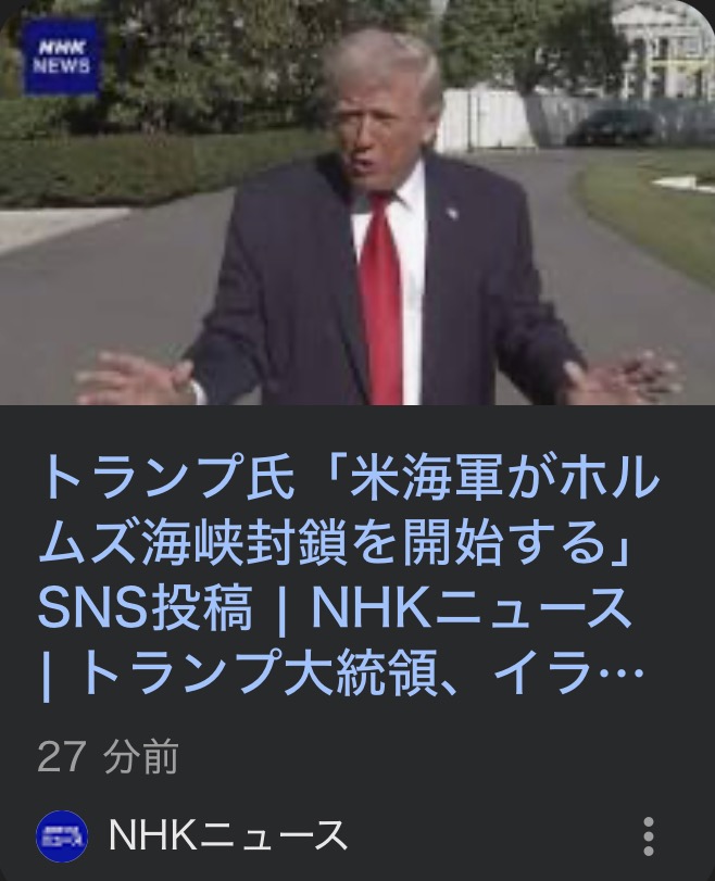 | … | 2526/04/12(日)23:08:34No.1419841575+我が国の首相はイランに公共の海峡を封鎖するなと言ったばかりなのだがどうするのだろう |