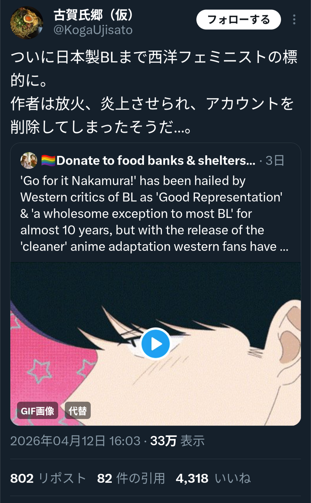 | … | 47126/04/13(月)05:36:42No.1419899001そうだねx3BL無罪が適用されなかったので腐女子も困惑してるらしいな |