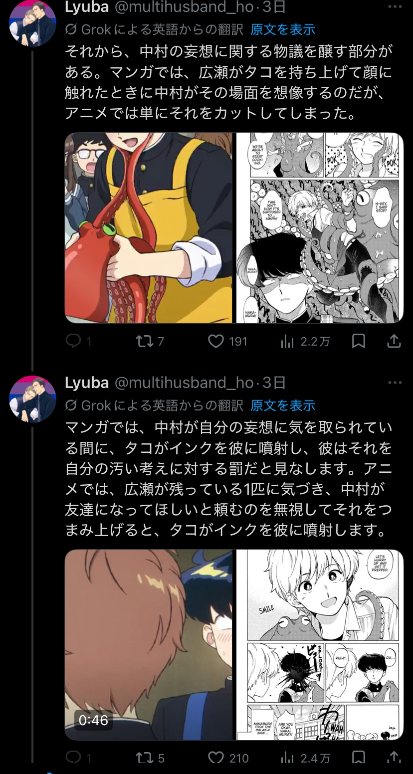 | … | 7726/04/13(月)01:41:29No.1419885031そうだねx9>アニメでは普通にタコを持つシーンで漫画だと触手プレイの絵がはいるんですよって言われたらそれ必要か?って話にはなるだろうな |
