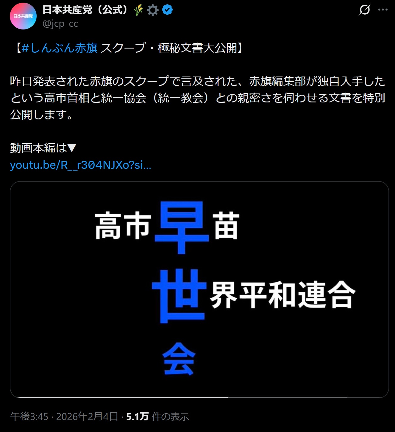 | … | 29126/04/13(月)13:08:39No.1419970148+>【ガチで悲報】高市早苗、YouTubeのネトウヨ動画に夢中。(ソースあり。フェイクじゃありません。) |