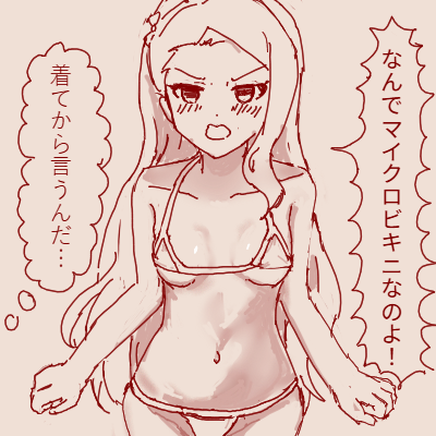 | … | 11626/04/13(月)13:12:27No.1419970927+エミリー…尊敬する伊織がマイクロビキニ着たからエミリーも着て… |