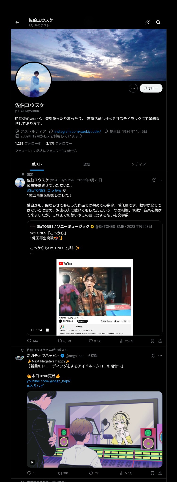 | … | 66726/04/13(月)19:16:00No.1420053187+youthK演技上手いし曲も良い曲作るけどYouthKのKを止めてくれる人は周りにいなかったんだよな |