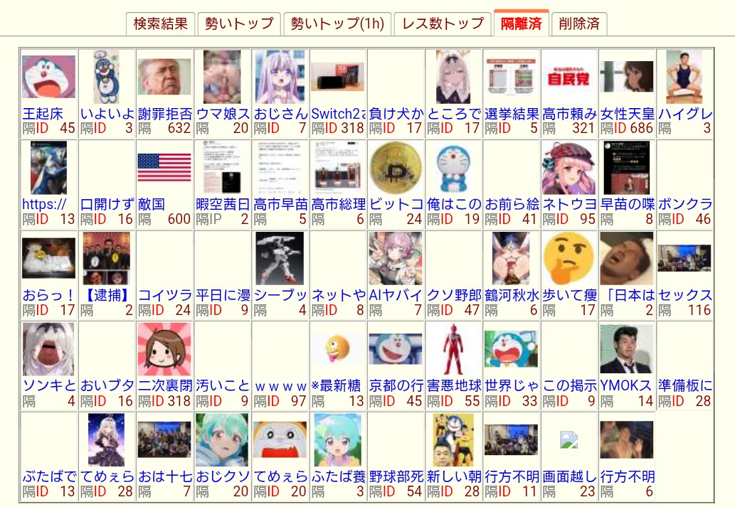 | … | 2626/04/14(火)14:58:15No.1420288247+いつからか政治の話ばっか多順にあるようになってた板 |