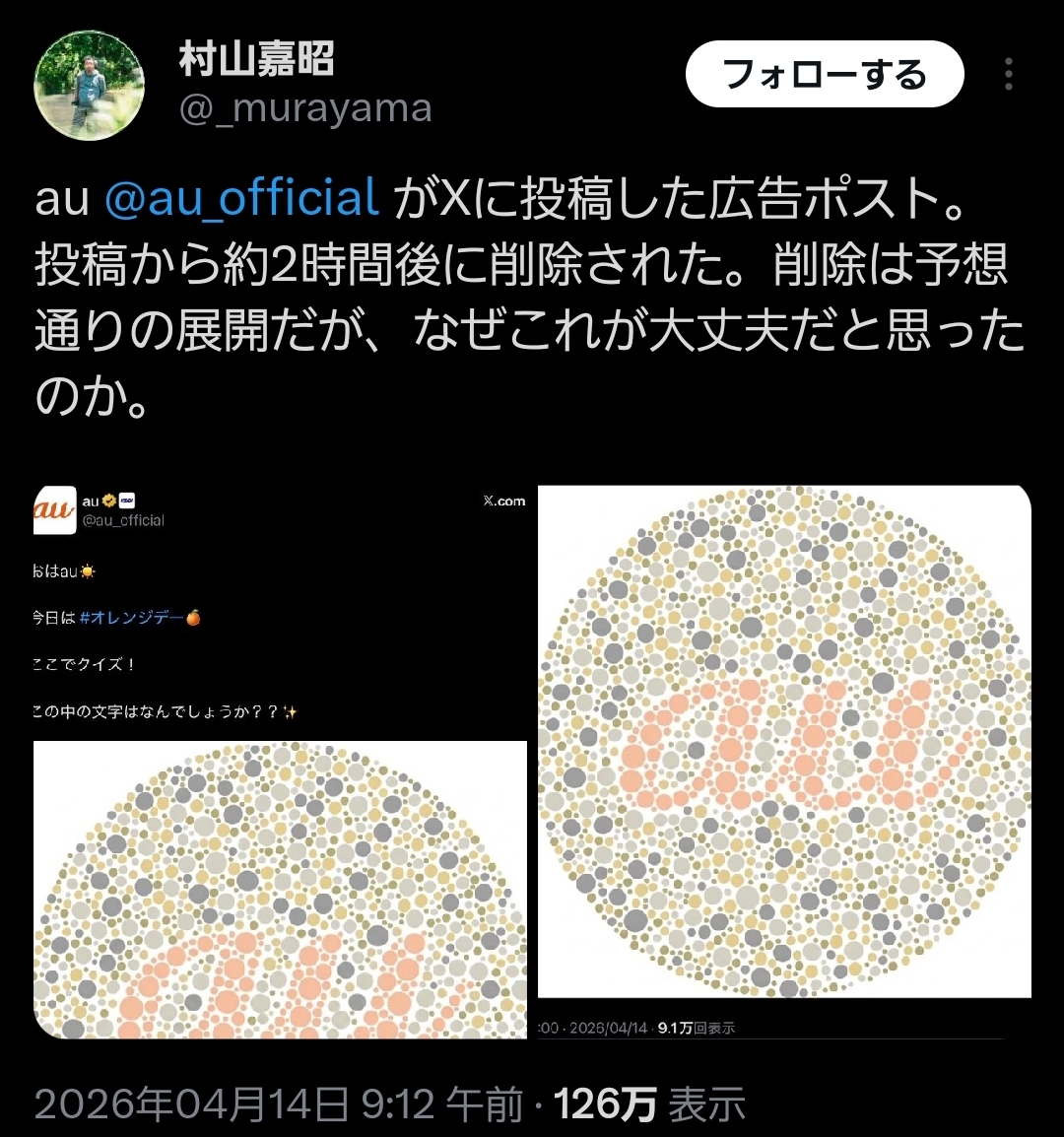 | … | 3426/04/14(火)14:46:11No.1420286006+そもそも色盲とauになんの関係があるんだっつーね |