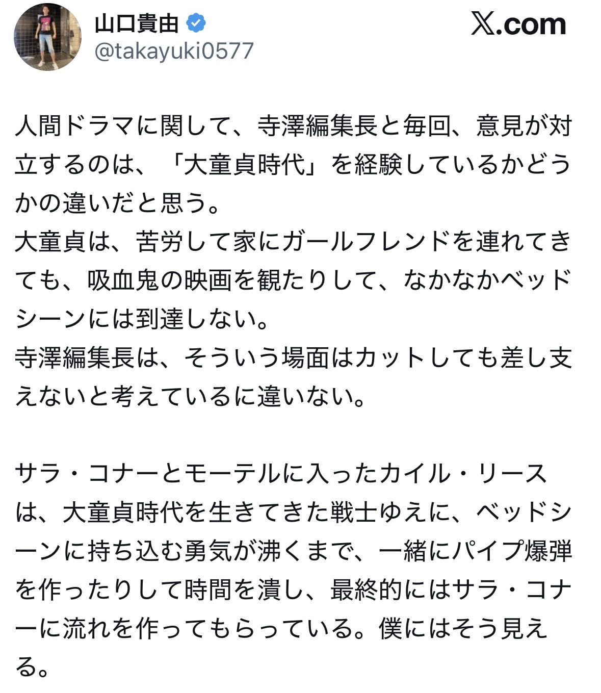 | … | 526/04/14(火)16:20:08No.1420303975そうだねx11キャメロンはターミネーター売れるまでの貧乏大童貞時代あるからこういう描写の必要性がわかるんだよね |