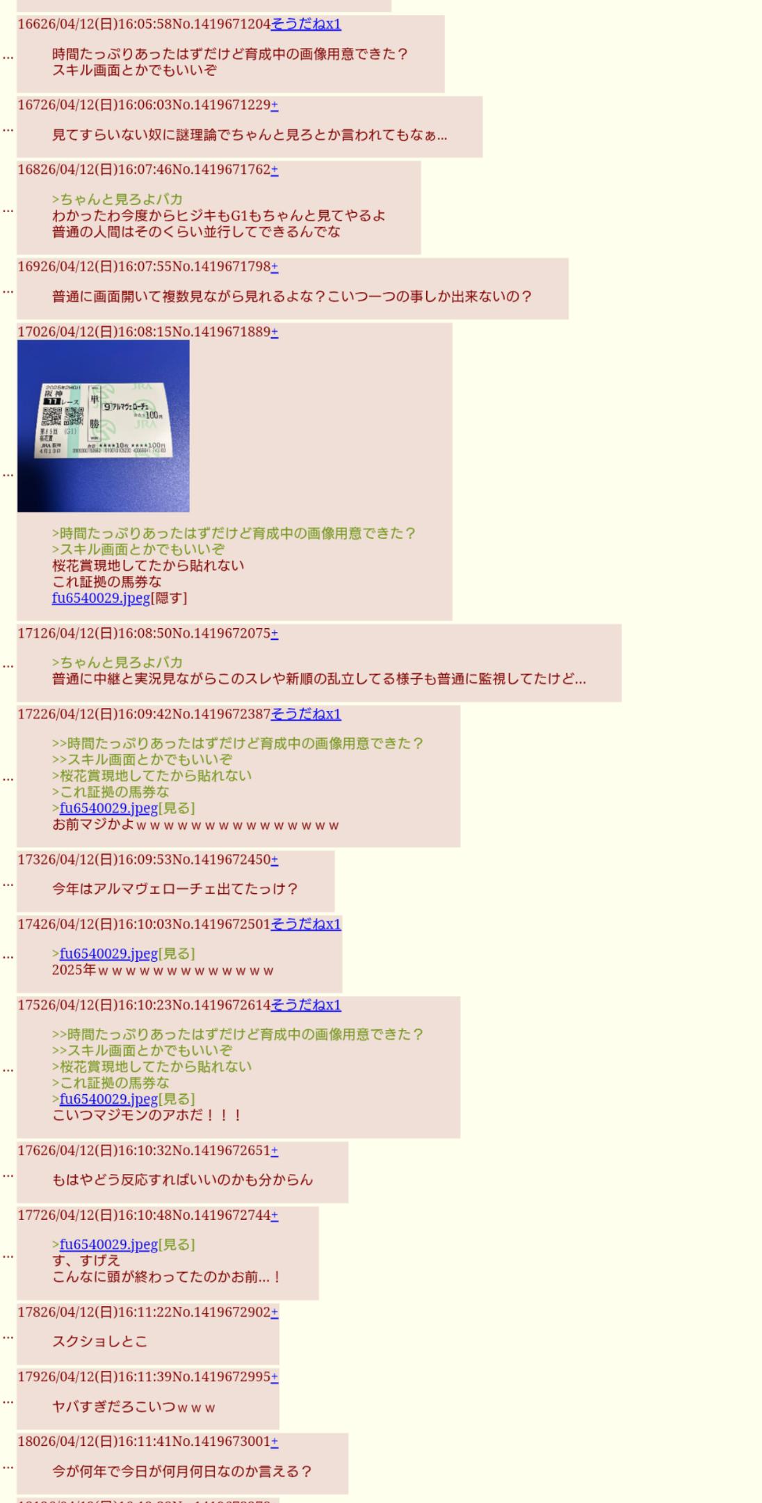| … | 17726/04/14(火)19:09:52No.1420346470そうだねx1>馬券にしっかり2025年4月13日って書かれてたのになぁ… |