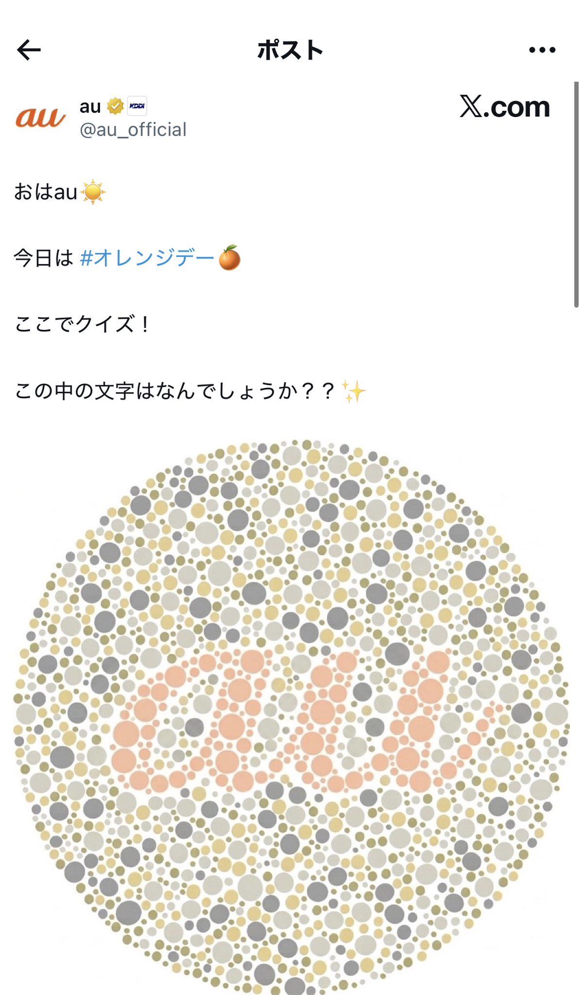 | … | 28826/04/14(火)21:06:59No.1420389778+何でオレンジデーに色覚検査ネタ…?と思ったけど「オレンジ色」の方と引っ掛けてるつもりだったの!? |