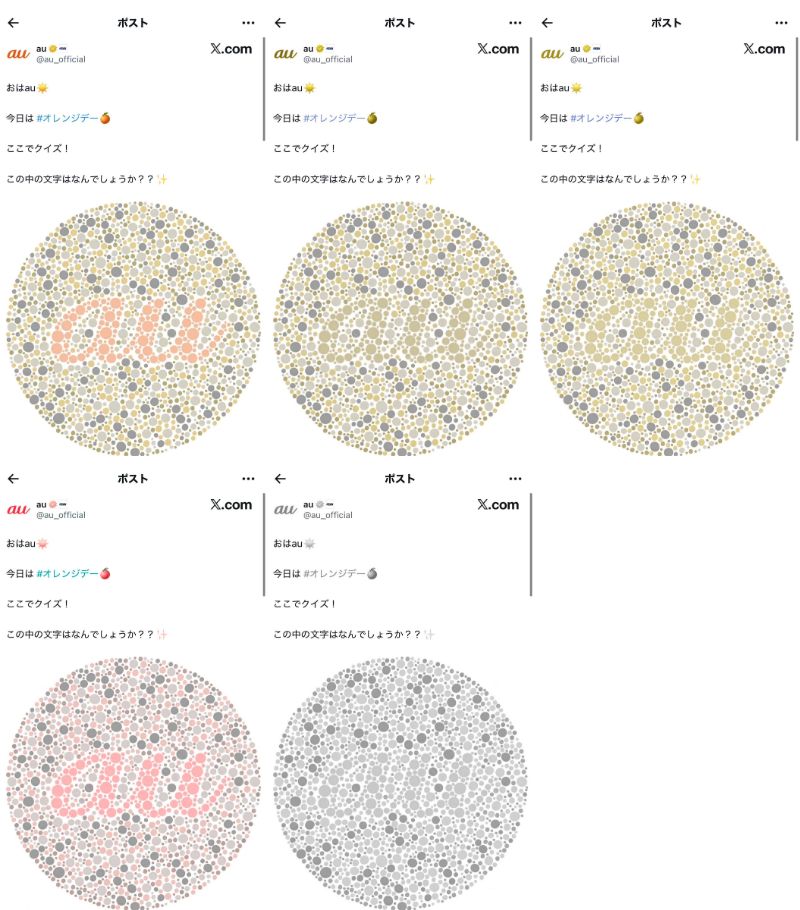 | … | 7626/04/14(火)20:29:55No.1420376366+>auだけに限らないけどメーカーは色覚障害のサポートのためにいろんな研究をして技術を育んでる |