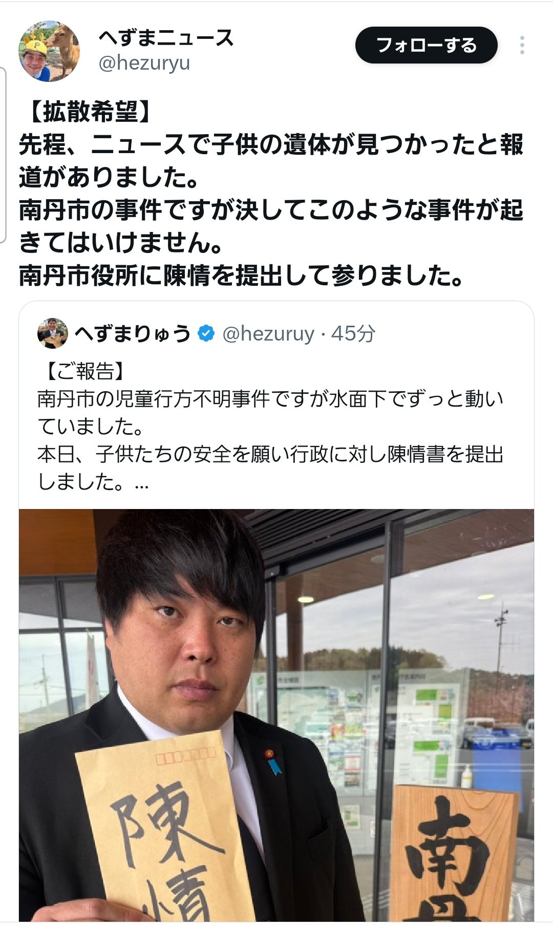 | … | 7026/04/15(水)00:08:48No.1420455786そうだねx2>>こいつを一度でも当選させた市民達はもっと真面目に市政を考えたほうがいい |