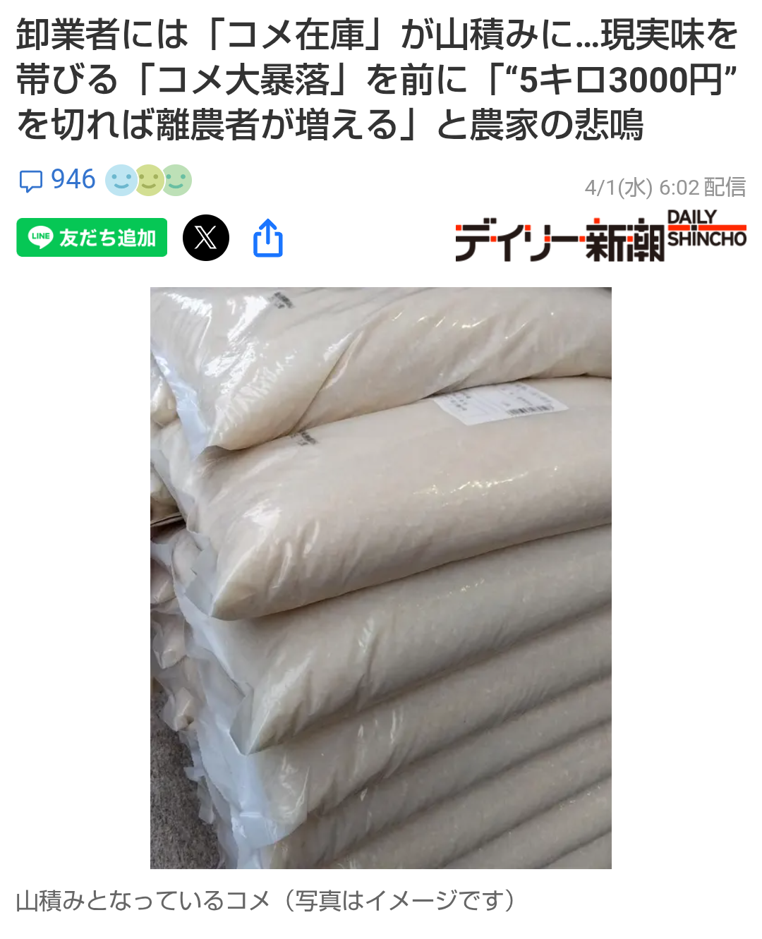 | … | 74026/04/15(水)08:25:16No.1420504019そうだねx2去年は米の価値はもっと高いんですけお!って言ってたのに今はもう完全に農家が減ると国の自給率が減って危機なんですけお保護してくだち!ってなってるのが即オチ2コマすぎる |
