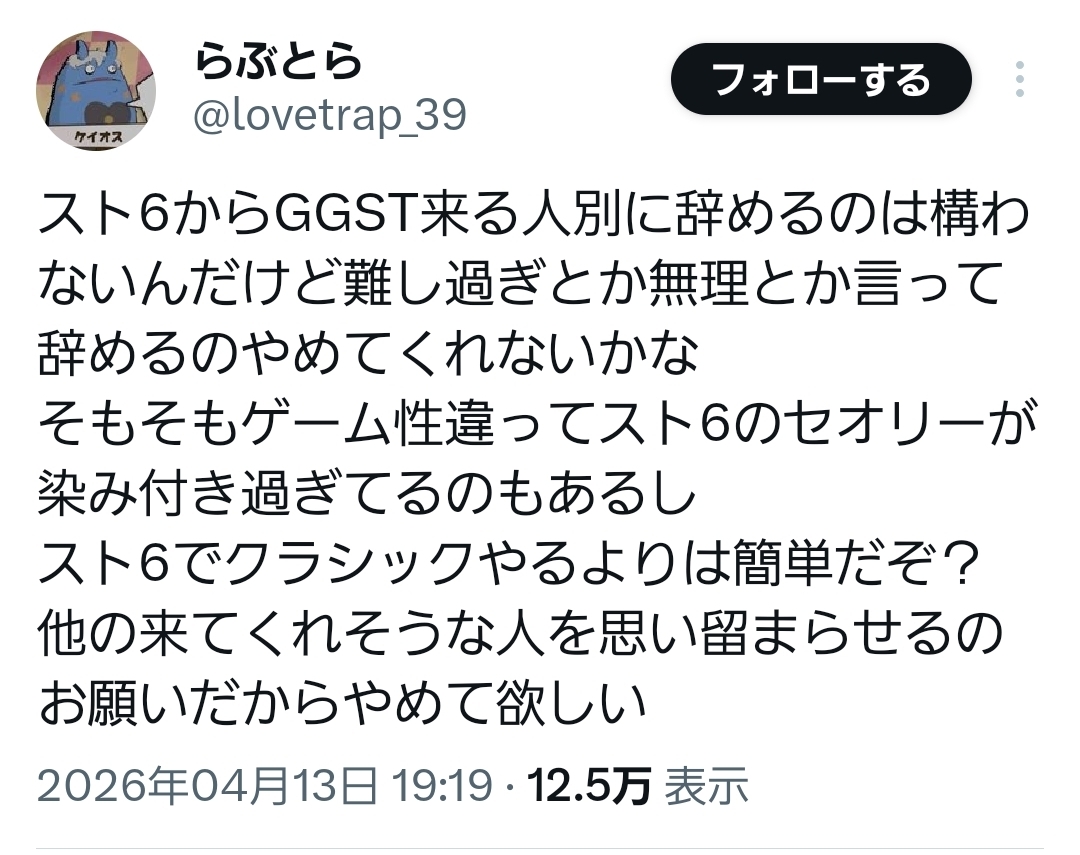 | … | 40526/04/15(水)10:09:09No.1420519596+海外勢はスト6プレイヤー向けのGGST動画を出して頑張ってるのに |
