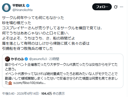 | … | 20026/04/15(水)11:55:27No.1420539107+ヒラコーのサークルってカットだけ載ってて当日は誰もいないor15分くらいで少量コピー誌捌いてすぐ撤収してるイメージしかない… |