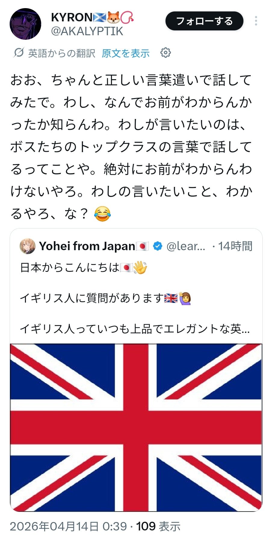 | … | 2026/04/15(水)14:17:15No.1420574928+猛虎弁のせいで外人からしたら日本が訛り大国みたいに思われてる可能性もある…? |
