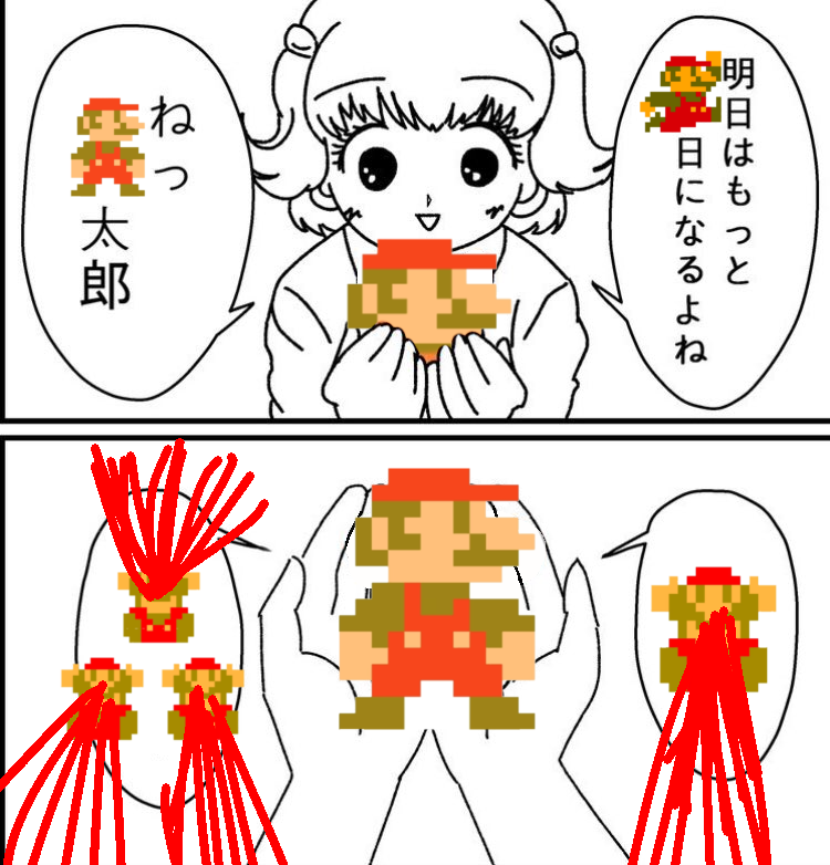 | … | 726/04/15(水)14:04:50No.1420572498そうだねx3手の中のマリオから血が出てないからダメ |