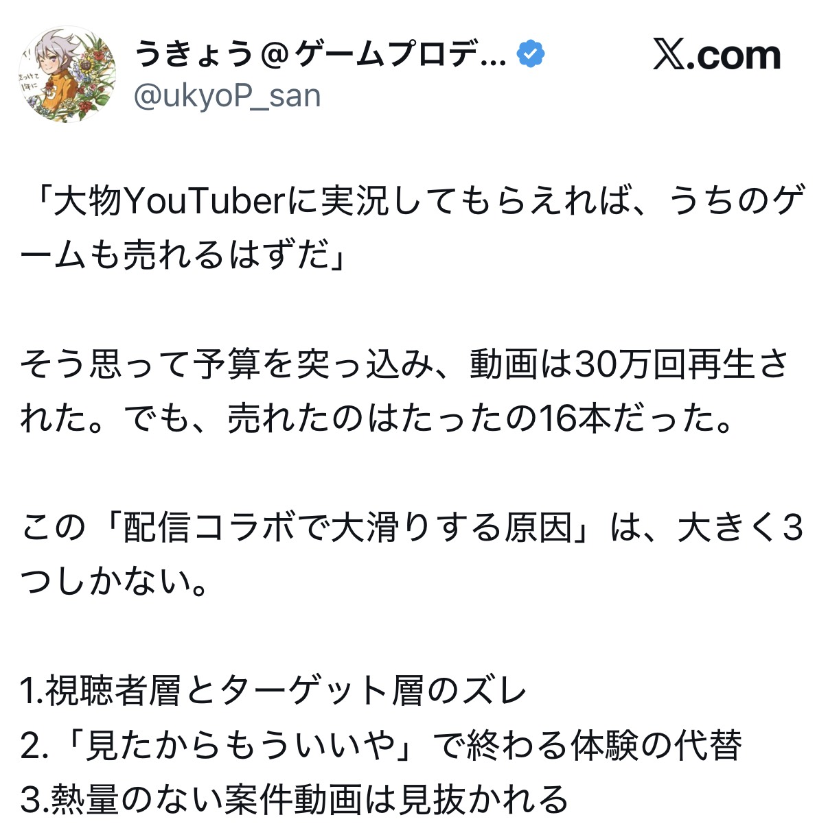| … | 1826/04/15(水)14:45:52No.1420580696そうだねx1ゲーム配信者は売れるゲームを見つける力は高いけどゲームを売る力はないっていう話だった |