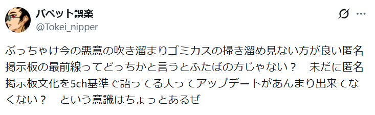 | … | 826/04/15(水)16:20:55No.1420599827そうだねx6ふたば、実害あるから嫌われてるんだよな。 |
