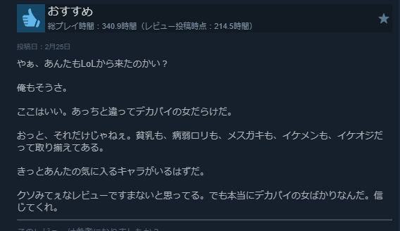 | … | 31726/04/15(水)22:11:26No.1420711363+>LOLが日本一のゲームになってないのが物語ってます… |