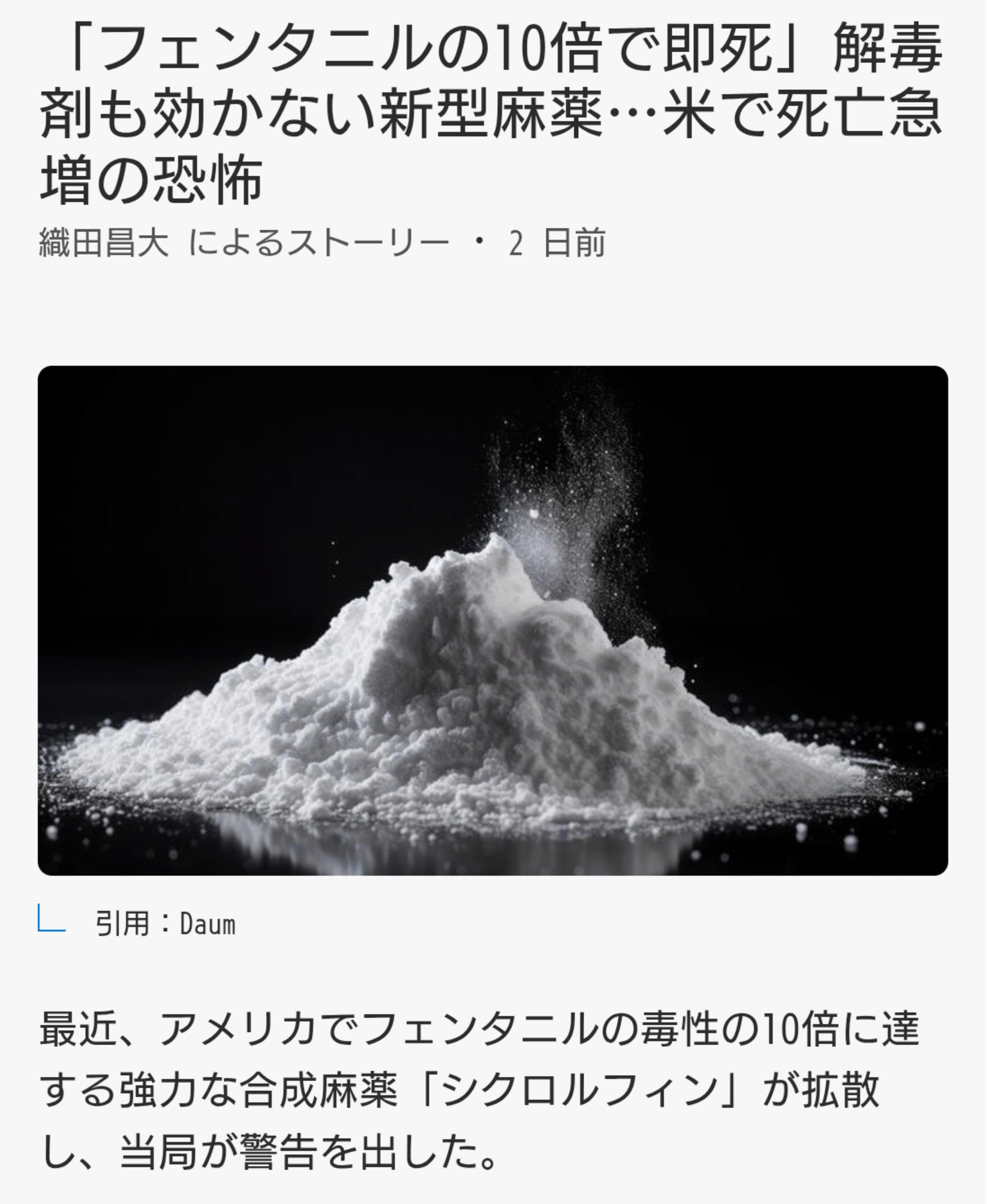 | … | 1626/04/16(木)06:05:49No.1420787144+>アメリカ国内の薬物過剰摂取による死亡原因の約60%を占める合成オピオイド「フェンタニル」は、医療用鎮痛剤モルヒネの50〜100倍の強さを持つとされる極めて強力な薬物だ。わずか2mg(塩の粒数個)で人を死亡させる可能性がある。 |