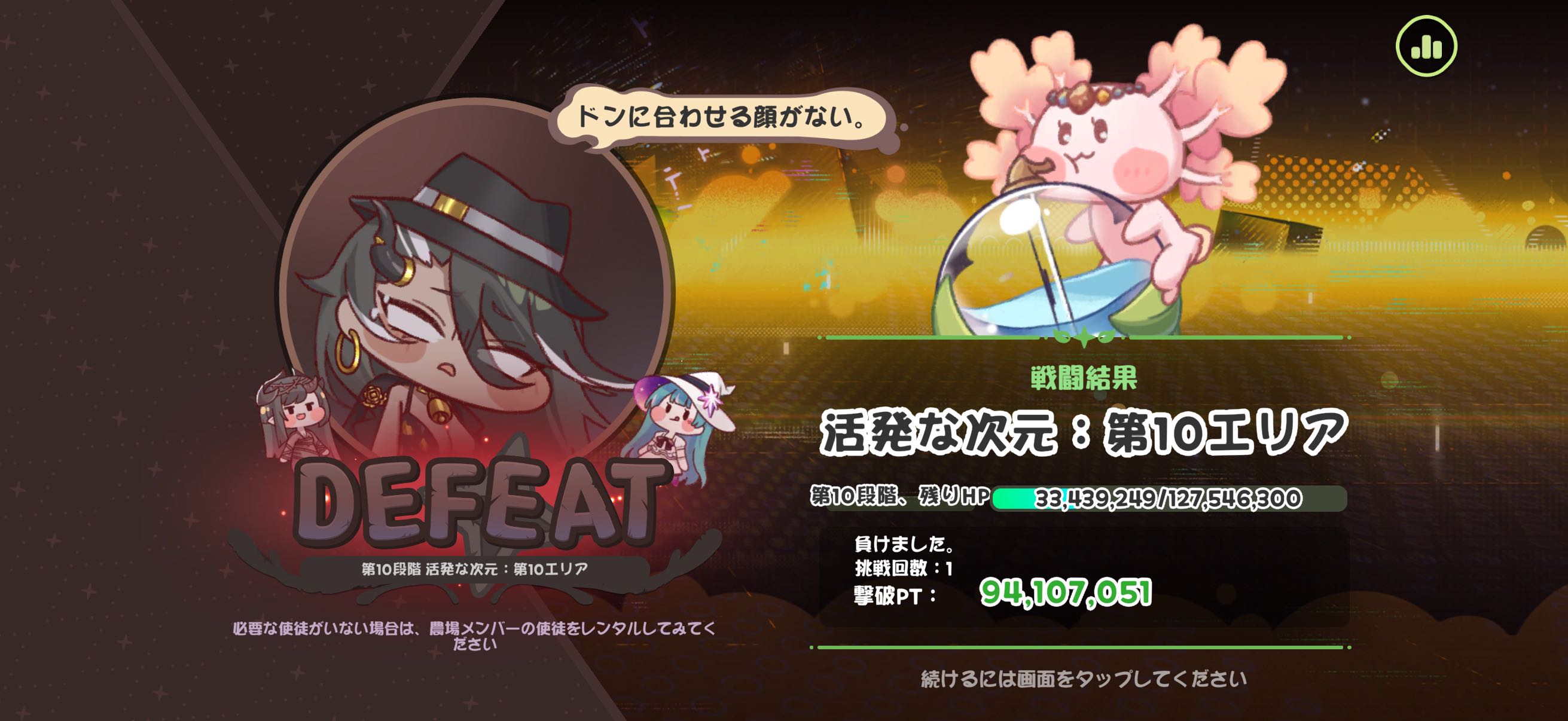 | … | 54226/04/16(木)12:54:10 ID:.mrWzZGsNo.1420852898+まさか1パーティで倒しきっても10%に余裕で入れないとは思わなかったにゃん… |