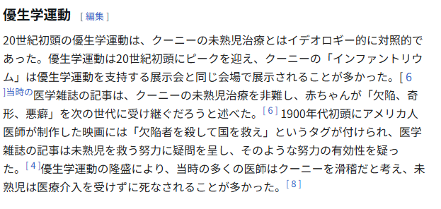 | … | 8426/04/16(木)12:22:46No.1420843278+> 最も有名な逸話は、長年にわたってニューヨークのコニーアイランドにおいて保育器に入れた未熟児を見世物としていたことである。見物料として25セントを徴収し、未熟児の両親が治療費を払う必要がないように、この収入を維持費に充てていた |
