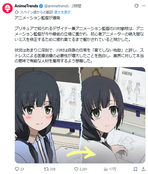 | … | 4726/04/16(木)11:17:56No.1420827858そうだねx1本人のポスト見たら作画修正指示を拒否する原画が増えてるらしい |