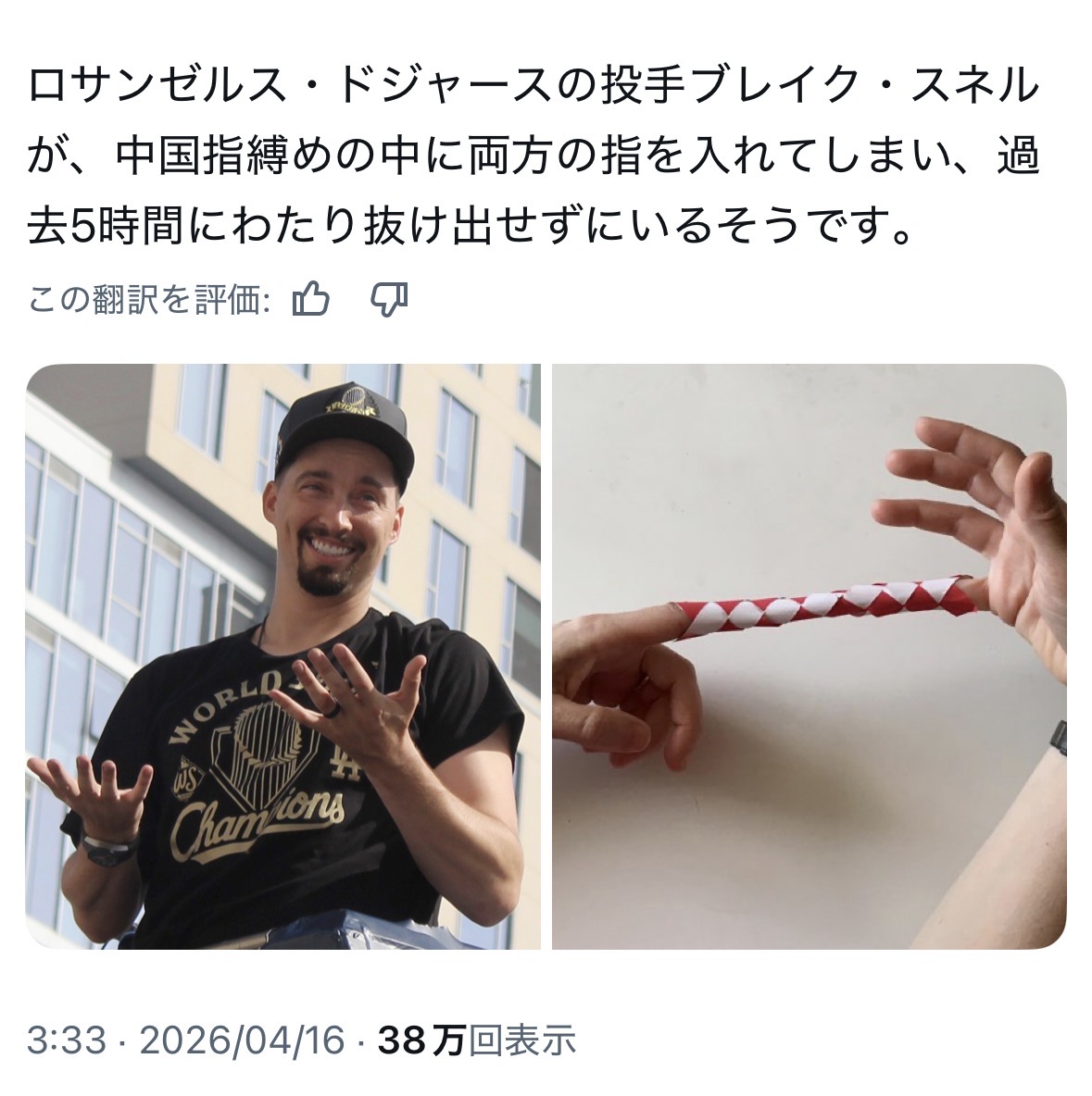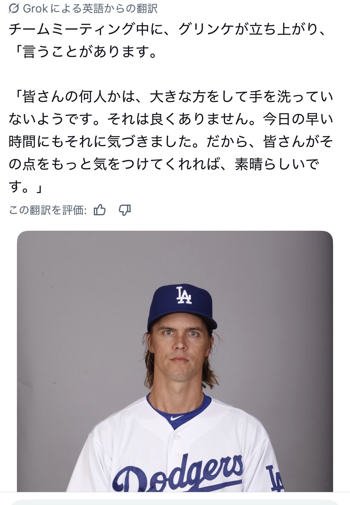 | … | 61426/04/16(木)15:46:37 ID:HSWmIP5cNo.1420887997+>「ダルトン・ラッシングが今夜ショウヘイ・オオタニの代わりにDHを務めたことについて:『それに慣れるとは思わないよ。断言するけど。でも、彼は自分のためにホームランを打ってくれって僕に言ってきたんだ。それが結果的にうまくいったんだと思う」とつづり、大谷がラッシングにかけた言葉を紹介している。 |