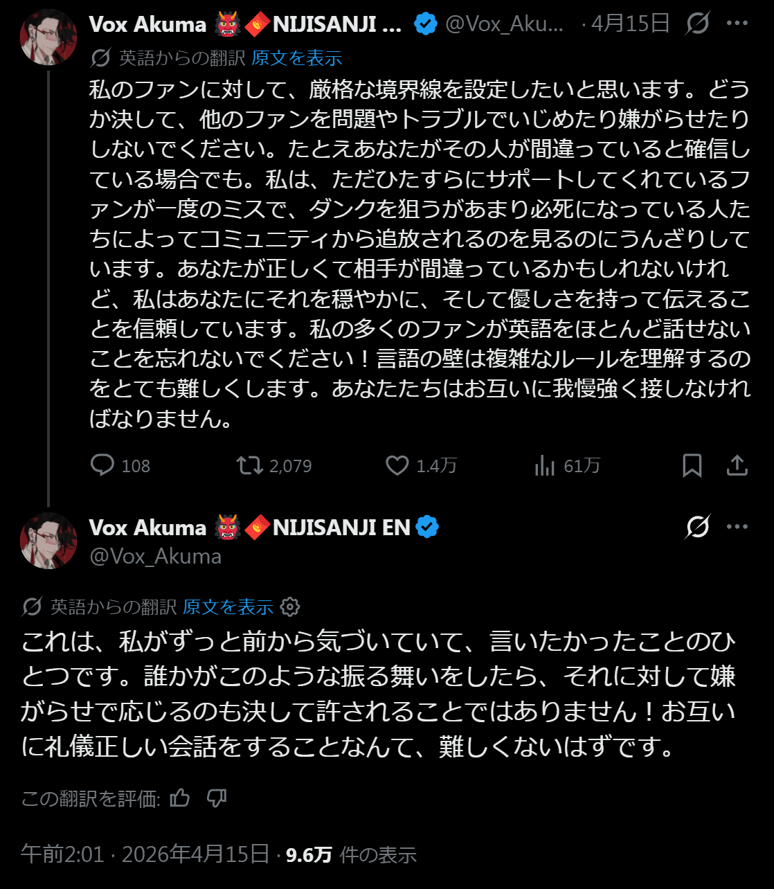 | … | 326/04/16(木)14:01:26No.1420868401+自分のファンの多くが英語を話せない自覚はあったのか |