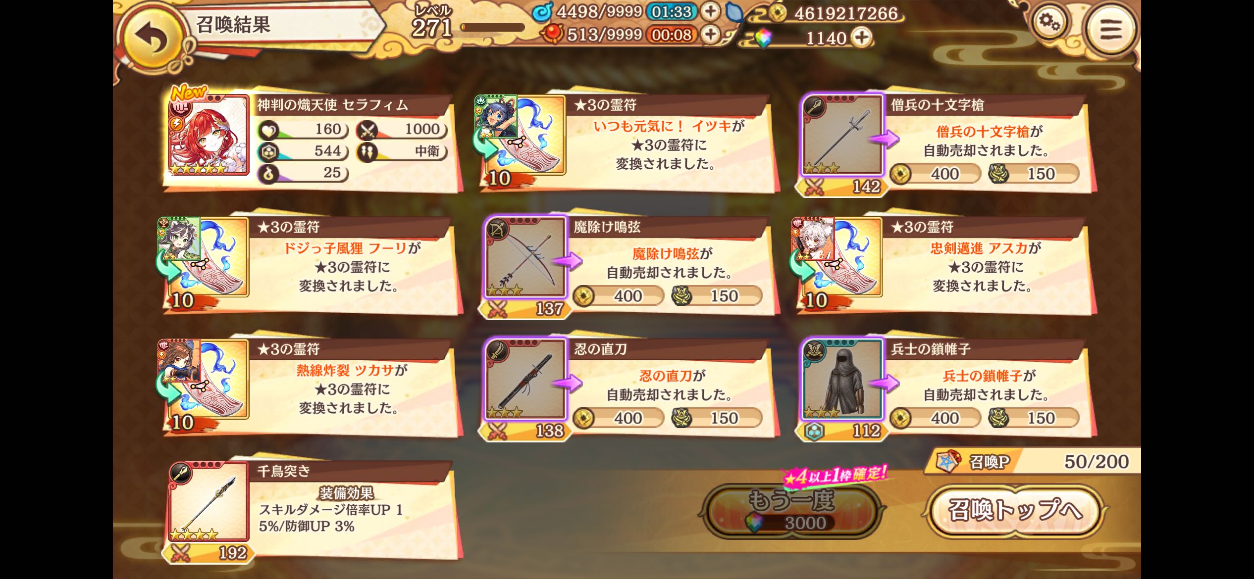 | … | 11926/04/16(木)18:24:19No.1420918582+この前恒常2人見逃したから今貯まりに貯まった召喚券が火を吹いてるっス |