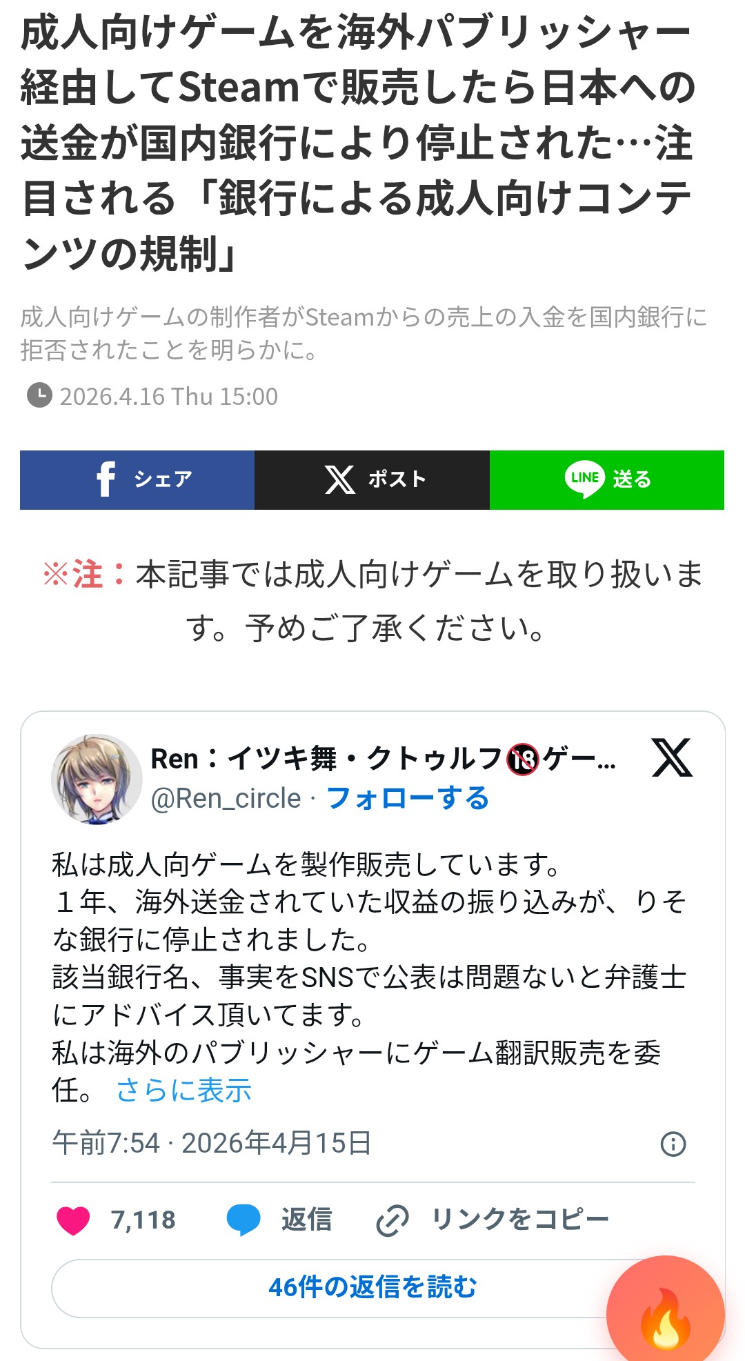 | … | 2226/04/16(木)17:41:33No.1420908598そうだねx2個人のsteam売り上げで怪しい海外送金扱いされて止まるのなんて前からエロ関係なくあっただろ |