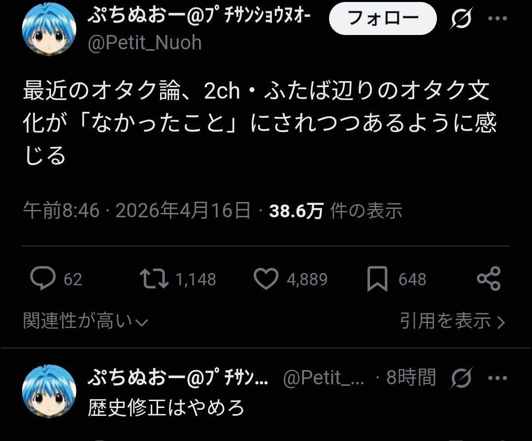 | … | 3026/04/16(木)19:40:51No.1420939982+>ネットの文化って色々バラけててオタク論みたいな大きな括りで語るのとは相性悪いと思う |