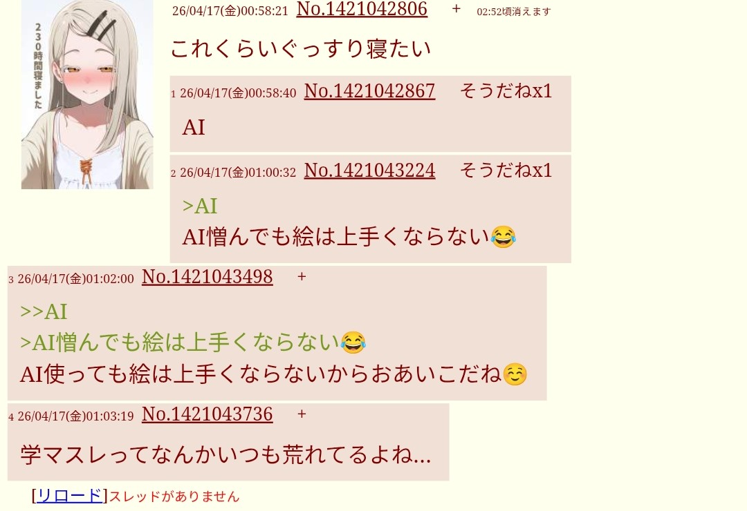 | … | 226/04/17(金)01:13:45No.1421045769そうだねx20スレ潰したアピール? |