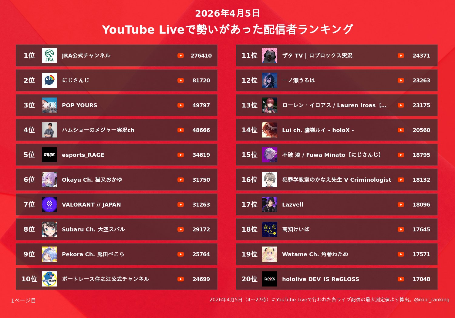 | … | 2526/04/17(金)07:36:57No.1421068902+中山GJの同接10万くらい行きませんかね… |